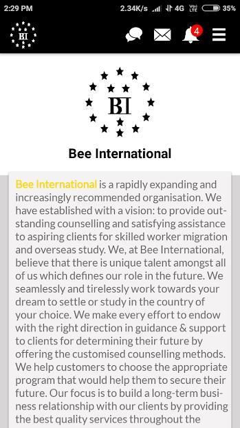 Bee International adalah organisasi yang berkembang pesat dan semakin direkomendasikan. Kami telah menetapkan dengan visi: untuk memberikan konseling yang luar biasa dan bantuan yang memuaskan untuk calon klien untuk migrasi pekerja terampil dan studi luar negeri. Kami, di Bee International, percaya bahwa ada bakat unik di antara kita semua yang mendefinisikan peran kita di masa depan. Kami bekerja tanpa batas dan tanpa lelah menuju impian Anda untuk menetap atau belajar di negara pilihan Anda. Kami melakukan segala upaya untuk memberkati dengan arah yang benar dalam bimbingan & dukungan kepada klien untuk menentukan masa depan mereka dengan menawarkan metode konseling yang disesuaikan. Kami membantu pelanggan untuk memilih program yang sesuai yang akan membantu mereka untuk mengamankan masa depan mereka. Fokus kami adalah membangun hubungan bisnis jangka panjang dengan klien kami dengan menyediakan layanan kualitas terbaik di seluruh proses. Anggota tim kami terlatih, kompeten, mudah bergaul dan selalu siap memfasilitasi peluang paling eksklusif untuk mencapai keinginan Anda. Semua layanan kami dimaksudkan agar sesuai dengan kemampuan Anda dan memastikan kepuasan pelanggan.