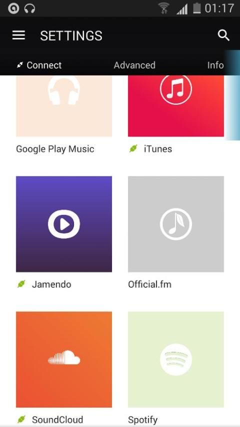 Sinkron dengan SoundCloud, Jamendo, iTunes, Spotify, Ampache dan lain-lain.
