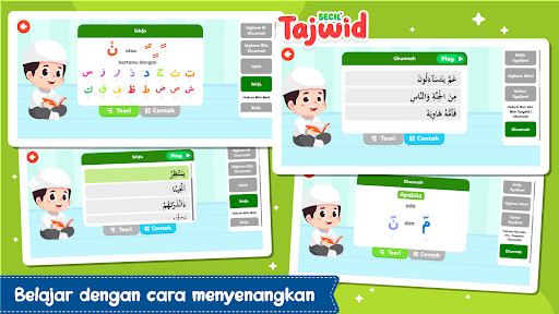 Pada aplikasi ini anak-anak akan belajar cara membaca alquran yang benar dengan hukum tajwid seperti idzhar, idzham bighunna, iqlab, ikhfa, hukum mad, hukum nun tasydid dan lain sebagai nya. Konsep pembelajaran pada aplikasi ini dirancang secara interaktif disertai permainan menarik dan suara yang menarik sehingga anak-anak tidak bosan saat bermain.