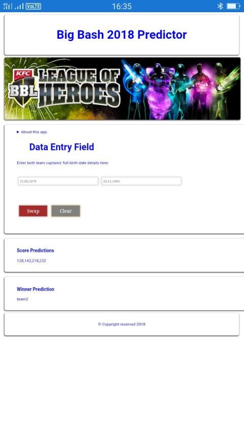 This is the predictor app for cricket Big Bash 2018 developed by Prasant Nair from Jamshedpur.
