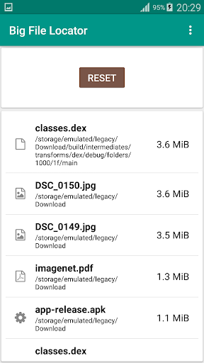 File besar dapat mengisi kartu SD dan penyimpanan internal dengan mudah.Locator File Besar membantu Anda menemukan file besar ini di telepon dan menghapusnya dengan cepat.Membersihkan file media atau gambar besar dapat membantu Anda mengatur ruang penyimpanan Anda.Ini gratis, ringan dan dengan desain bahan!