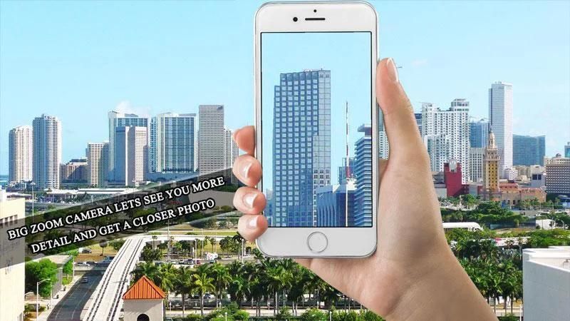 Aplikasi Big Zoom Camera - Kamera mega Zoom akan membiarkan Anda mengambil foto bahkan dengan x50 zoom (zoom maksimum tergantung pada Anda built-in model kamera). Anda akan dapat menetapkan nilai zoom hardware maksimal saat mengambil foto. Selain itu, program ini dilengkapi dengan digital zoom mega, yang akan membiarkan Anda mengamati dan benda-benda foto yang di kejauhan. Program ini juga dapat digunakan sebagai teropong virtual, teleskop atau kaca pembesar digital. Ini adalah alat yang ideal untuk mata-mata dan pecinta alam liar.