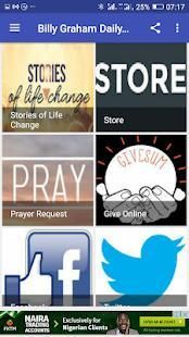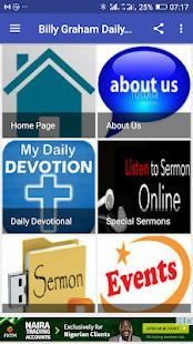 Download aplikasi ini gratis untuk mendapatkan Billy Graham Pengabdian baru setiap hari dalam format mobile-friendly mudah dibaca. Menonton dan berbagi beberapa video yang paling-diminta termasuk spesial TV bulanan kami dan klasik khotbah Billy Graham. Mendengarkan program radio terbaru kami termasuk Hour mingguan Keputusan menampilkan pesan inspiratif dari Billy Graham dan Franklin Graham - ditambah perang salib klasik dan live streaming dari 106,9 The Light. Anda akan mendapatkan Alkitab dalam mobile-friendly membaca dan mendengarkan-keras format audio dengan rencana bacaan yang disesuaikan untuk membawa firman Allah hidup dalam kehidupan sehari-hari Anda. Aplikasi ini juga memiliki spiritual bantuan dan penginjilan alat untuk membantu Anda berbagi Kristus dengan orang lain.