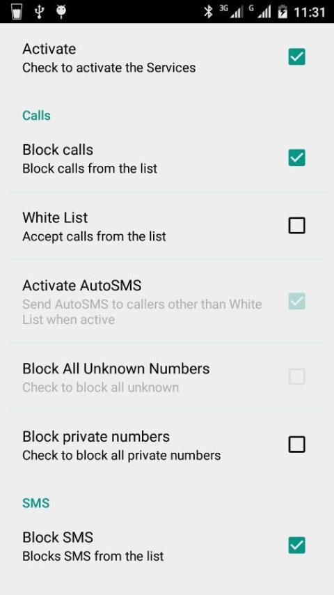 panggilan yang tidak diinginkan fitur Daftar Black List -Block (Menolak panggilan) -Block SMS spam (Cukup memblokir daftar hitam) -Pilih apakah akan memblokir baik SMS dan Panggilan atau memblokir salah satu dari mereka. Memblokir semua panggilan tidak dikenal. -Anda dapat memblokir semua panggilan yang tidak ada dalam daftar kontak Anda. -Block Nomor pribadi Putih Daftar -Block semua nomor masuk kecuali angka yang tertera di Whitelist