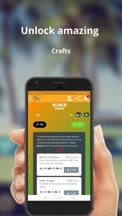 You can withdraw your collected cash or spend it on BlockSmash features. Experience points will help you move up the levels and unlock more free hits and resource types. Resources can be used to craft boosters and gain advantages.