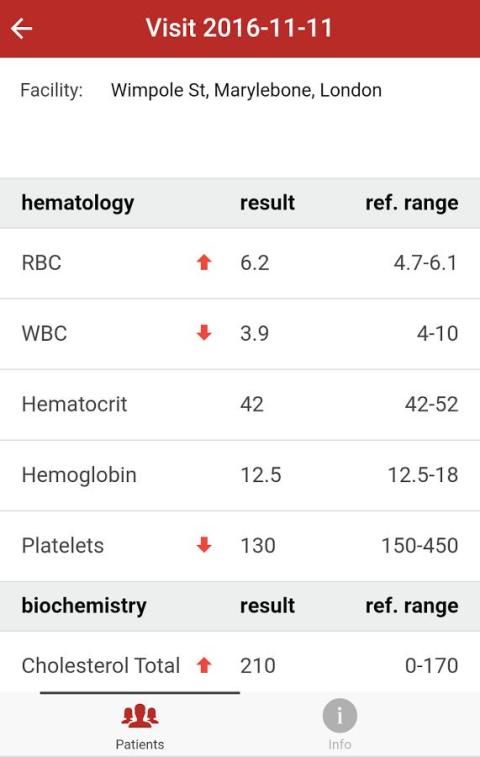 Aplikasi ini menunjukkan konsep umum bagaimana dokter dapat melihat data pasien mereka, terutama hasil tes darah. Setiap tes darah dikalibrasi dan normalisasi sehingga dokter melihat jika dalam atau di luar jangkauan.
