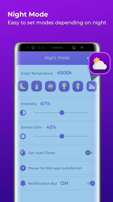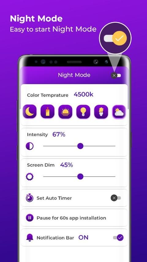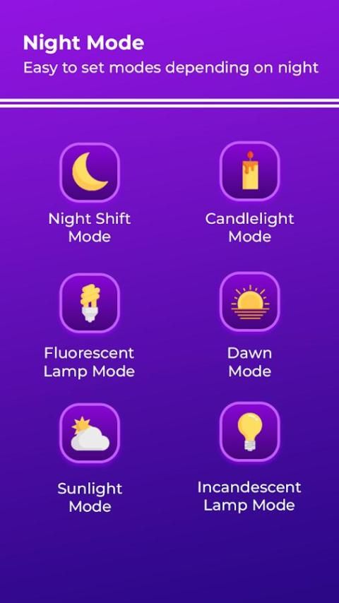 Gunakan ponsel di larut malam tanpa kelelahan mata. Instal Night Mode Filter Blue Light. Menyesuaikan kecerahan layar sehingga Anda dapat bekerja pada lingkungan cahaya rendah. intensitas warna layar Set membutuhkan sesuai sensitivitas mata Anda. Juga setiap kali Anda bekerja di larut malam di telepon seperti menonton film, game, atau pekerjaan lain, yang menyebabkan Anda buta warna mata. Untuk itu