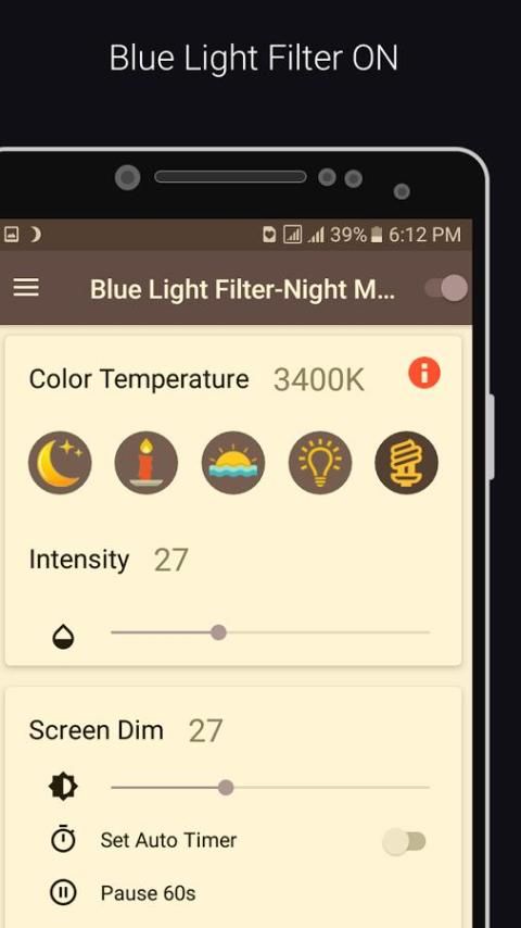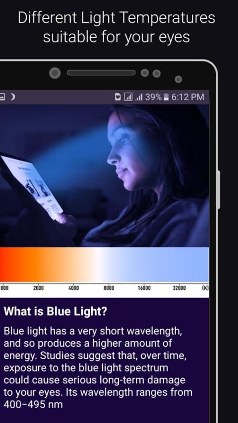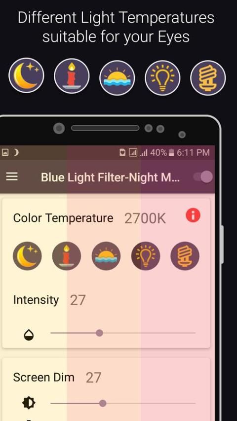Night Mode memiliki 5 suhu filter warna untuk memilih dari. Hal ini dapat mengurangi cahaya biru dengan menyesuaikan layar untuk menampilkan warna-warna alami, maka merawat mata Anda dan membantu Anda untuk mengambil tidur yang lebih baik. Dengan filter cahaya biru ini, mata Anda akan dilindungi dan Anda akan merasa jauh lebih mudah untuk tertidur.