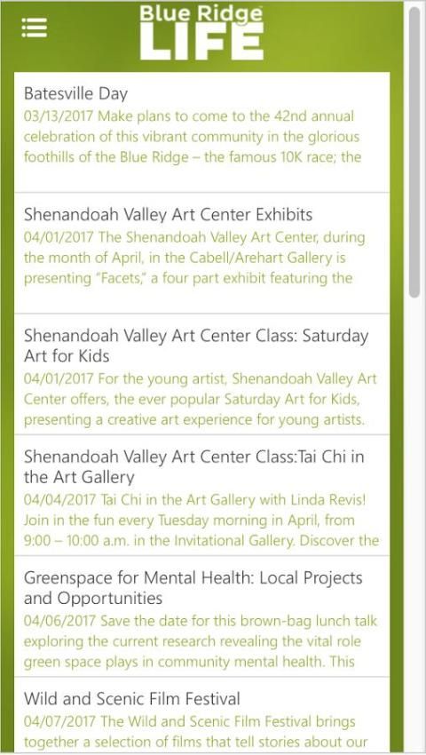 Blue Ridge Hidup app membuatnya mudah bagi Anda untuk tetap di atas berita dan cuaca ketika itu terjadi, seperti yang terjadi. Berbasis di Nelson County, Virginia, kami adalah fitur bulanan dan majalah gaya hidup dengan kehadiran digital sehari-hari. cakupan area kami meliputi Albemarle, Amherst, Augusta, Nelson, Rockbridge, dan kabupaten Rockingham.
