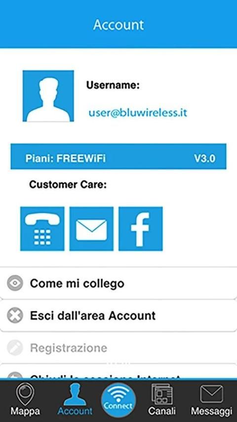 Migliorata la funzione di connessione alla rete WiFi con il tasto Connect con una spiegazione più dettagliata dello stato di connessione alla rete degli HotSpot WiFi di Bluwireless. Guida per ricercare sulla mappa la rete di punti di accesso Free WiFi di Bluwireless.