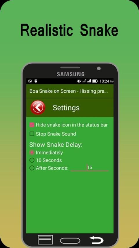 Open Boa Ular pada layar - mendesis prank dan mengatur waktu sekitar beberapa seconds.Press: "Tampilkan ular". Aplikasi akan berjalan di latar belakang. Berikan telepon kembali ke "korban" Anda dia akan menjaga mata di telepon. Setelah beberapa detik, ular menakutkan akan muncul di layar dan akan menakut-nakuti teman Anda.