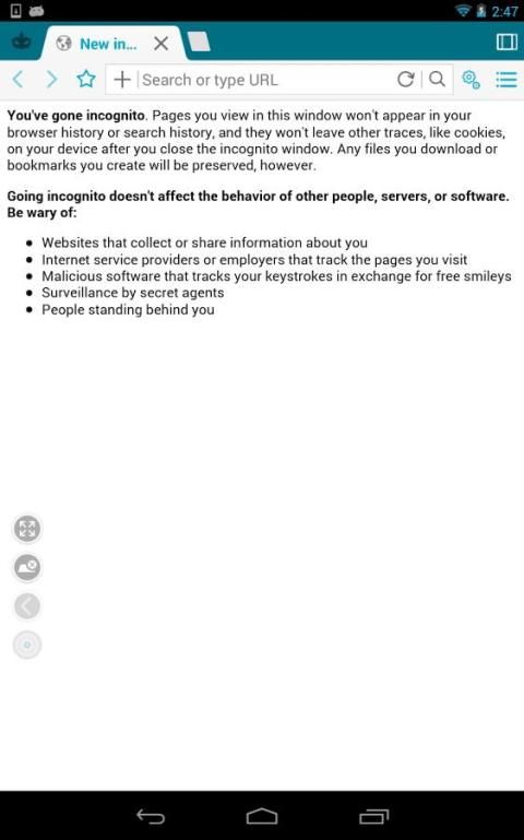 Independent tab bar khusus dirancang untuk browsing pribadi. Browser tidak ingat sejarah, kue dan cache untuk tab incognito.