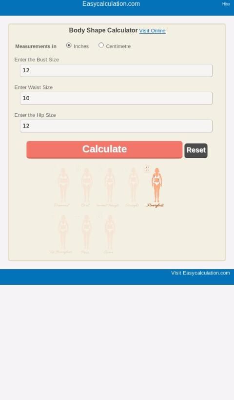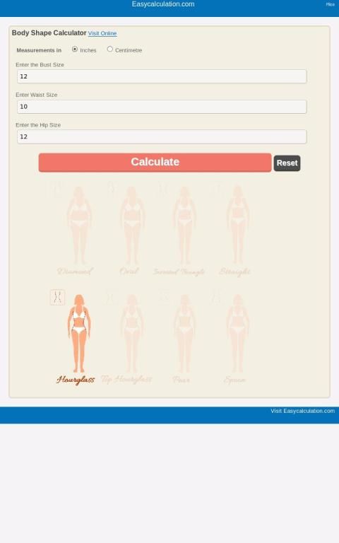 Gunakan ini secara online bentuk tubuh kalkulator untuk menemukan jenis tubuh (lurus, pear, sendok, jam pasir, atas jam pasir, terbalik segitiga, oval, berlian) yang Anda miliki.
