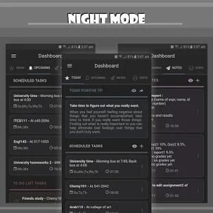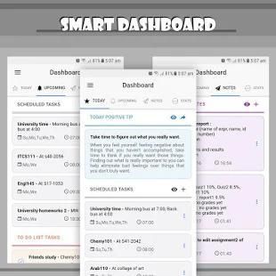 - Dashboard: is a smart page that view your today tasks, upcoming tasks, notes and general stats for your tasks.