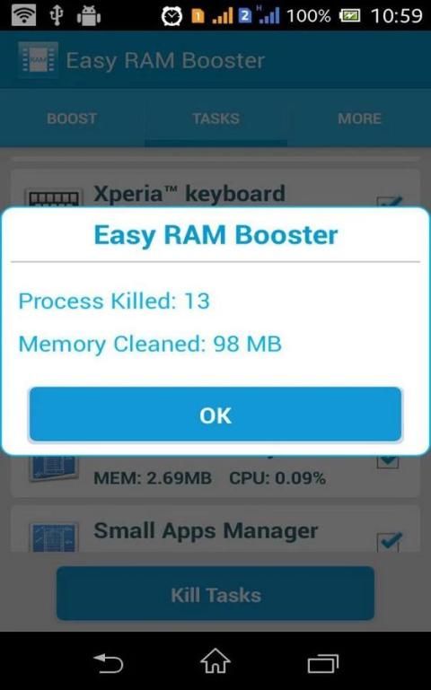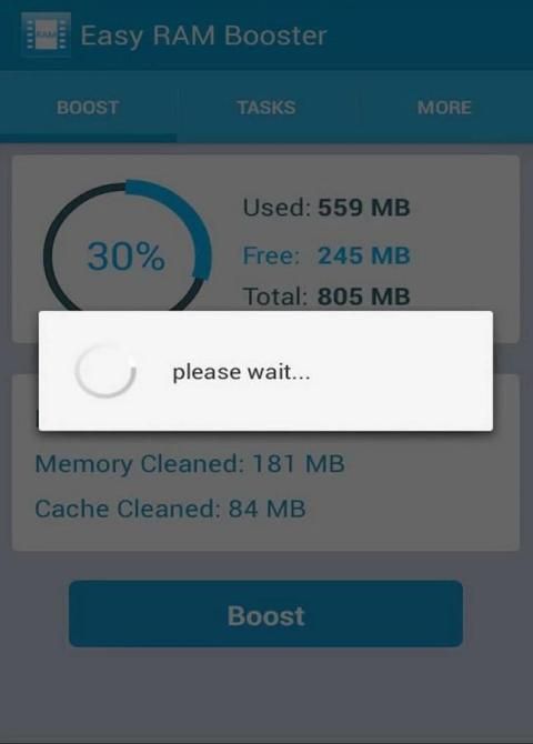 You can easly booster RAM with just on tap. Touch boost button and clear running process. In Tasks tab you can swipe to clean individual process from ram memory. In more tab you also know about your internal and external memory status.