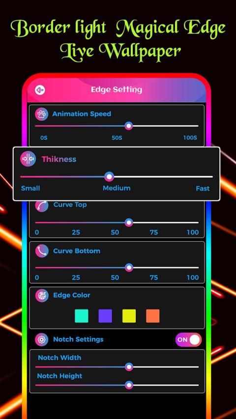 app allows you to set Edge effects like Animation Speed, Thickness, Curve Top, Curve bottom, Edge color and also best option to set Notch to make more adorable edge effects. An application which allows animated live wallpaper theme with that you can set Edge lighting live wallpaper in your device. the application does not consume more battery while you set in your mobile screen as live wallpaper.