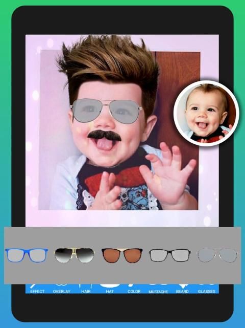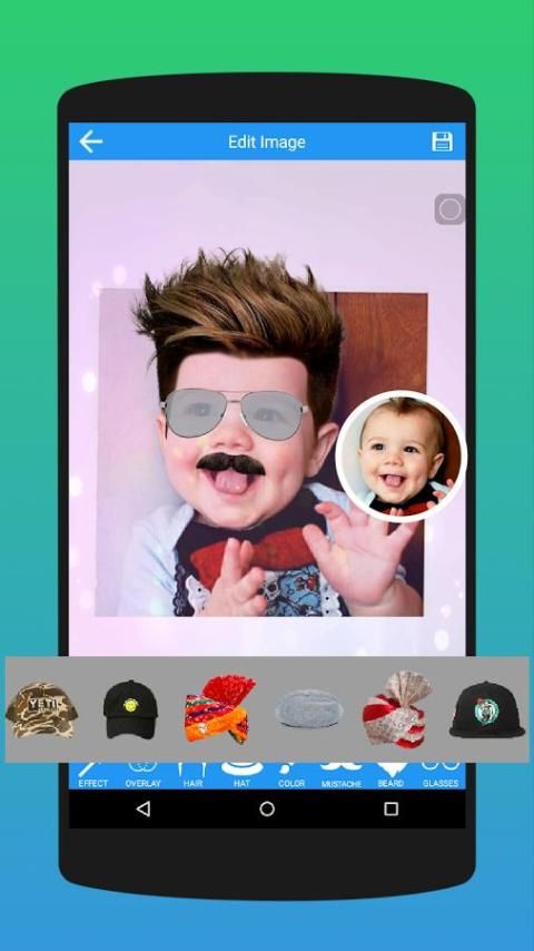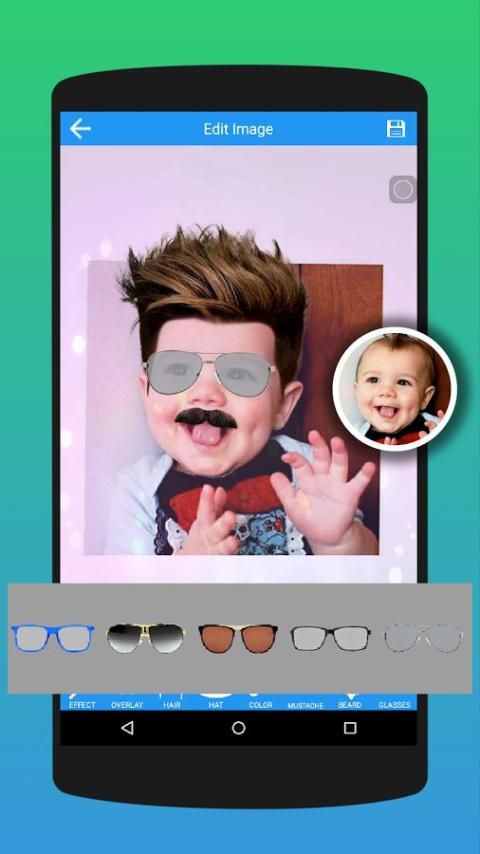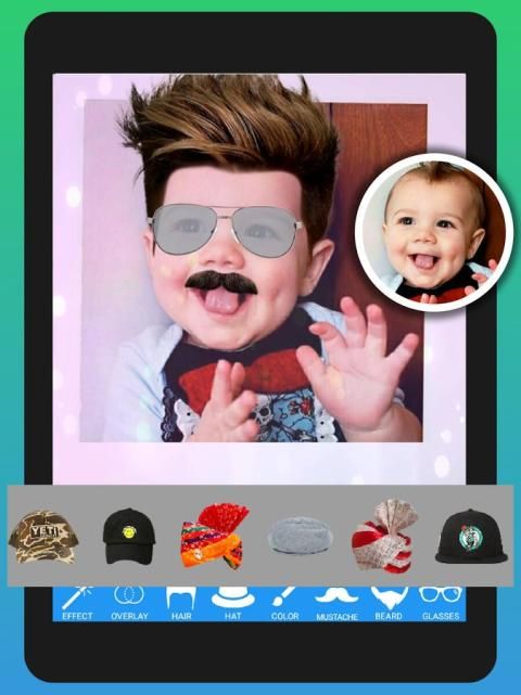 Personalisasi foto Anda dengan efek, overlay, jenggot, kumis, gaya rambut, googles, turban / topi dan teks