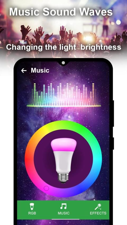 Putar musik di ponsel pintar Anda dan kecerahan bohlam LED RGB akan berubah