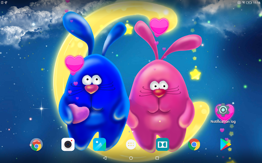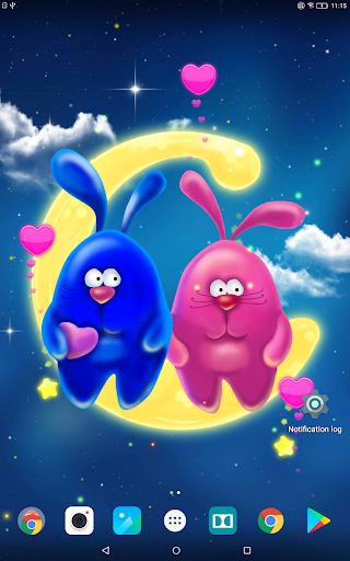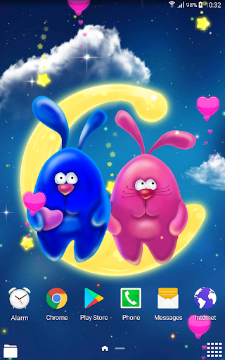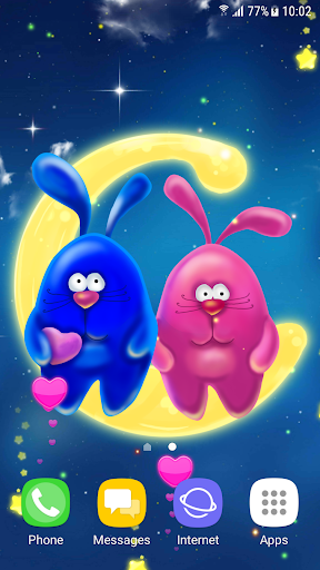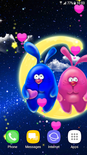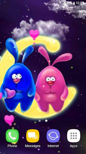 Bunnies Romantic Live Wallpaper - screensaver romantis animasi gratis yang indah dengan kelinci imut animasi yang duduk di bulan dan melihat hati mengambang dan bintang. Unduh wallpaper hidup gratis ini sekarang dan nikmati: Malam berbintang yang indah, bintang jatuh ajaib, hati merah muda dinamis mengambang, kunang-kunang terbang dan lampu, awan berbulu dan kelinci kartun animasi yang menakjubkan.