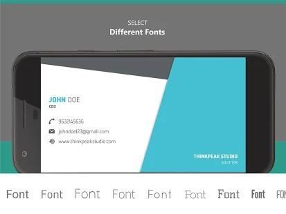 Anda perlu memberikan informasi Anda yang ingin Anda tampilkan di kartu bisnis Anda. Kemudian aplikasi akan membiarkan Anda memilih desain yang berbeda kartu, font yang berbeda, warna yang berbeda, dll