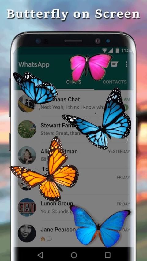 Aplikasi ini Butterfly on Layar atau kupu-kupu dalam display Telepon animasi yang sangat realistis kupu-kupu terbang. Serangga akan terbang di atas telepon Anda, duduk di ikon (atau sekitar mereka) dan menyebarkan sayap. Animasi gerak hewan biru telah dibuat atas dasar video nyata winglike serangga. Berkat itu, pergerakan sayap dan batang terlihat sangat realistis. Setiap orang akan mendapatkan pranked bahwa kupu-kupu nyata duduk di layar.