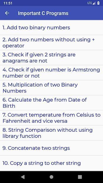 • Aplikasi memberikan Kode Sumber dari Program C penting yang sering ditanyakan selama wawancara IT.