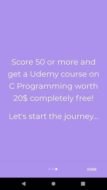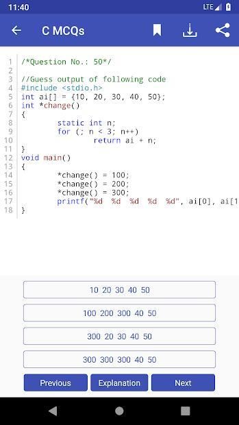 • Aplikasi ini membuat Anda berjalan melalui beberapa kode C kecil dalam bentuk MCQ. Setiap pertanyaan dalam MCQ dirancang khusus untuk membuat Anda mempelajari beberapa konsep menarik dalam pemrograman C.