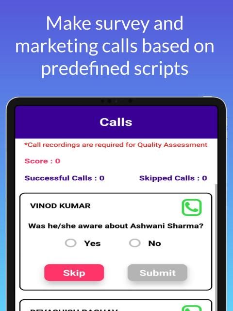 Bekerja: Masuk ke 'CallE' di ponsel android Anda, lakukan panggilan telepon dan bicarakan dengan orang-orang seperti Anda tentang survei atau pemasaran, misalnya: melakukan survei Net Promoter Score, menanyakan orang-orang tentang diabetes atau membujuk mereka untuk kandidat pemilu.