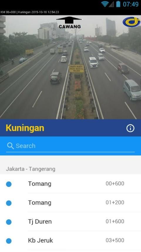 Menampilkan kondisi terkini (real-time) keadaan dari berbagai Jalan Tol di Jakarta, Bandung, Semarang