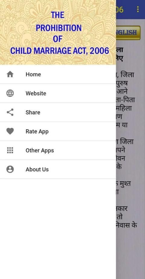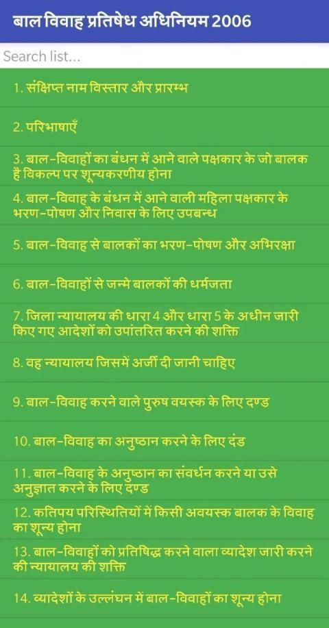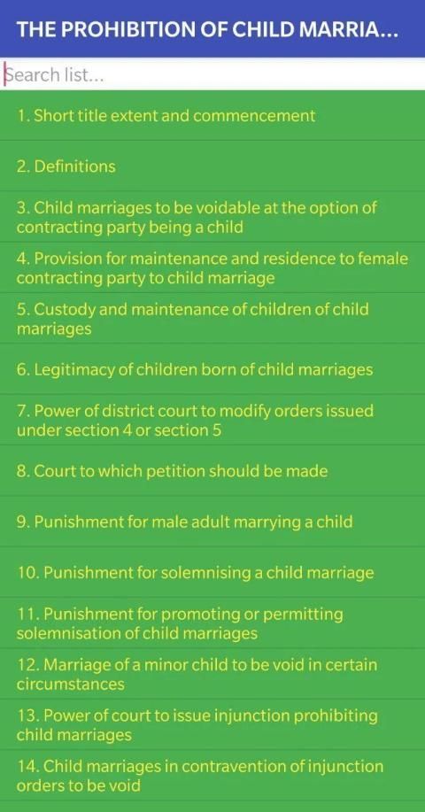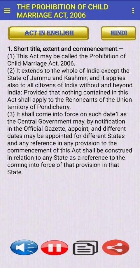 THE PROHIBITION OF CHILD MARRIAGE ACT, 2006 App has advance search facility in both Hindi and English language. It also comes with speak facility which narrates act in English.