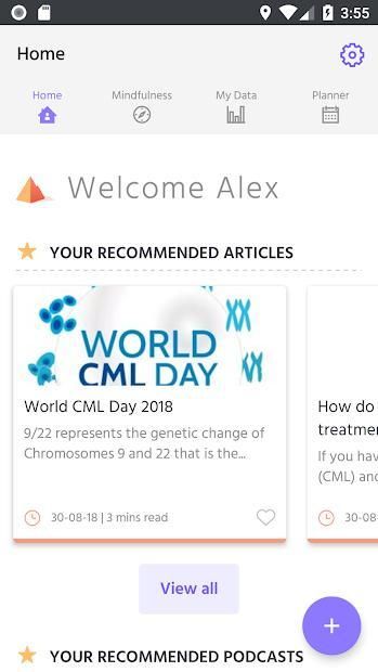 Content is tailored to the user’s profile. They are able to keep track of their physical and emotional wellbeing, keep a record of test results and upcoming appointments, listen to mindfulness modules, and learn about CML and its treatment.