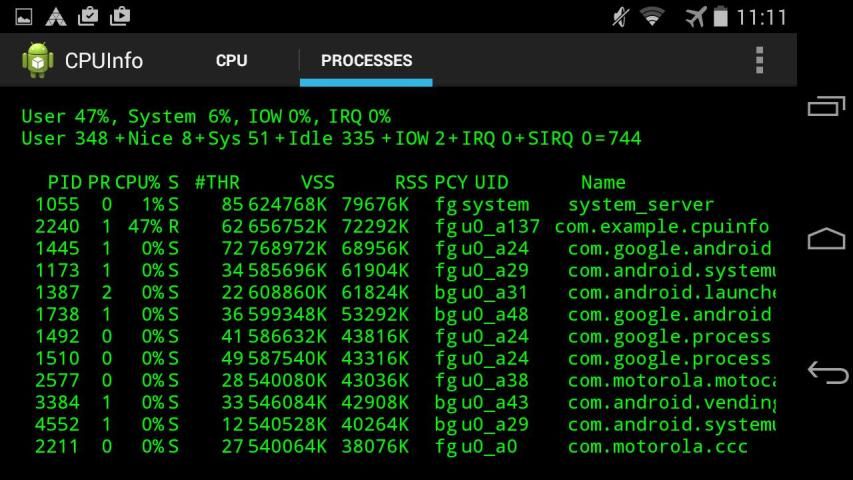 Sekarang dengan 1.1 update terbaru, Info CPU dapat menjalankan ps! Periksa proses individu dengan nama paket atau proses ID untuk query perilakunya.