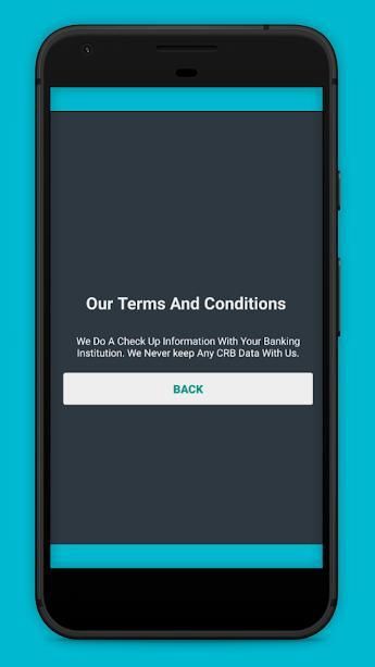 CRB Checker adalah aplikasi seluler yang memeriksa validitas pengguna sebelum mengajukan pinjaman apa pun. Biro referensi kredit di Kenya telah diberikan kepada beberapa perusahaan untuk memeriksa validitas pengguna untuk mengakses layanan kredit apa pun. Kami menawarkan layanan kami secara gratis dan ini adalah waktu nyata. Sebelum mengajukan pinjaman berbasis seluler seperti Tala, Mswhari, KCB Mpesa dan Branch, pengguna disarankan untuk memeriksa skor kredit mereka. Ini akan meningkatkan peluang mereka untuk mendapatkan kredit atau uang muka yang mereka terapkan.