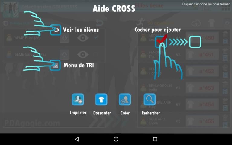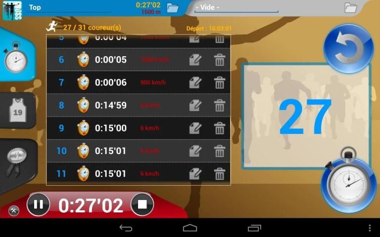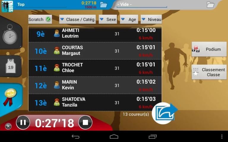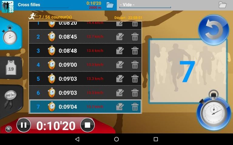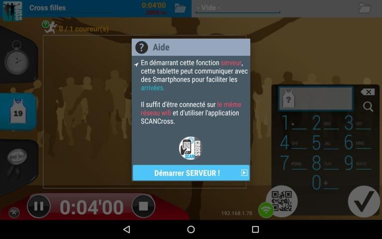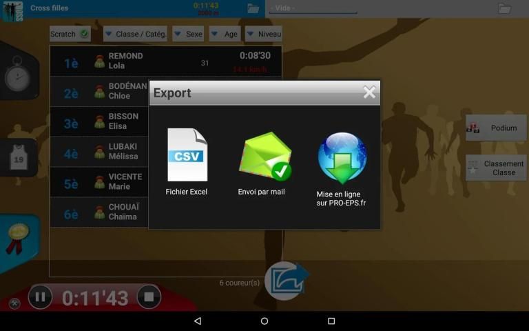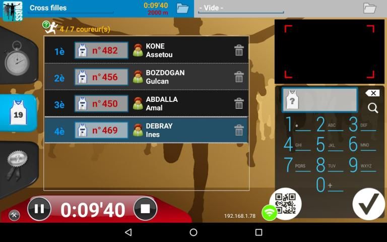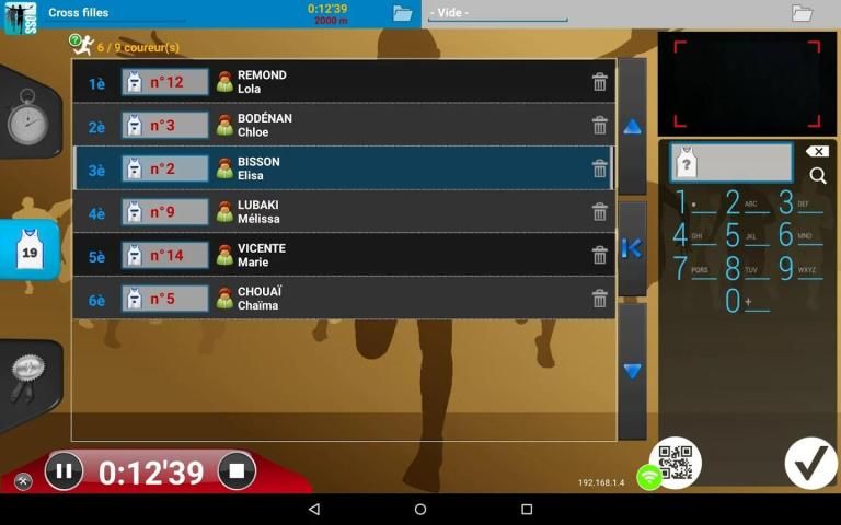 Tidak perlu untuk PC, satu tablet cukup untuk mengelola semua tugas Anda: import, dossardage, waktu, memilah pelari secara real time (berdasarkan kategori, jenis kelamin, usia, kelas tetapi juga untuk sekolah), manajemen kecepatan (untuk perbandingan dengan VMA), semuanya dikelola!