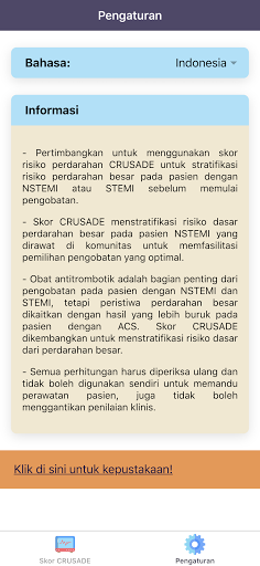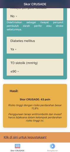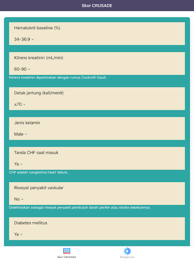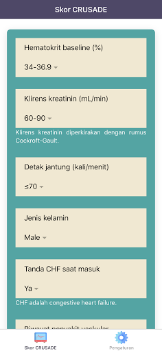 Perhatian: semua perhitungan harus diperiksa ulang dan tidak boleh digunakan sendiri untuk memandu perawatan pasien, juga tidak boleh menggantikan penilaian klinis. Perhitungan dalam aplikasi "Skor CRUSADE untuk SKA: Kalkulator Kardiologi" ini mungkin berbeda dengan praktik lokal Anda. Konsultasikan ke dokter ahli bila diperlukan.