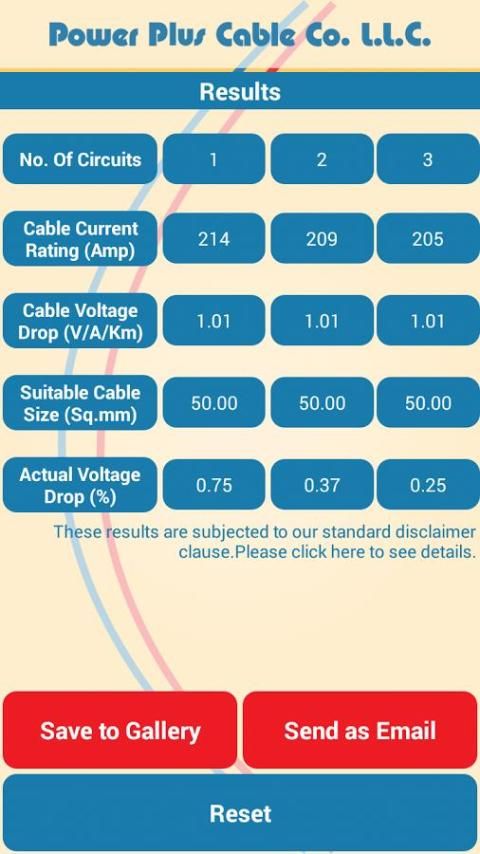 Ukuran kabel kalkulator yang dikembangkan oleh Power Plus Cable Co LLC, Fujairah, Uni Emirat Arab, menyediakan cara cepat dan mudah untuk memilih ukuran yang sesuai kabel yang dibutuhkan untuk sirkuit listrik. Cocok untuk listrik insinyur, konsultan, installer kabel listrik dan desainer. Ukuran kabel kalkulator juga memberikan drop tegangan di sirkuit. Alat penting untuk semua Electrical Engineers bekerja di industri MEP.