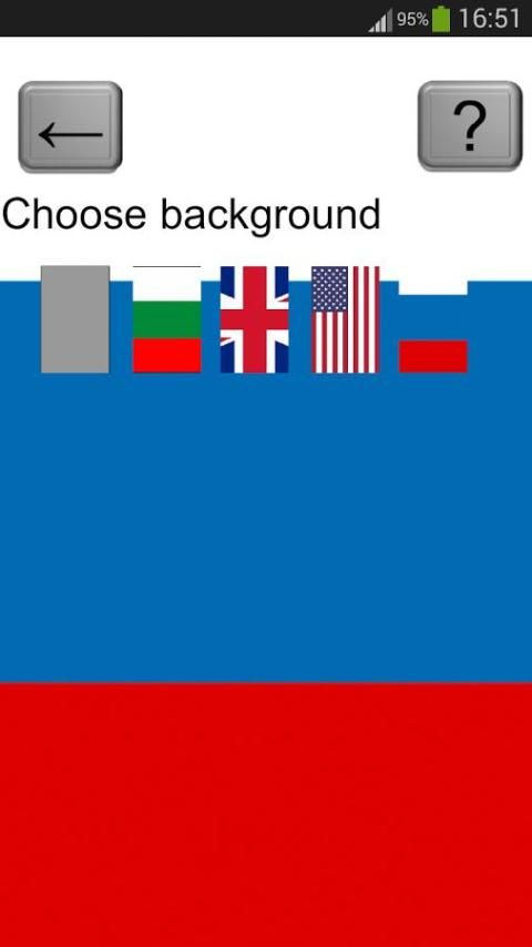- Anda dapat mengubah latar belakang. Anda dapat memilih bendera Amerika Serikat, Inggris Raya, Bulgaria, Rusia atau hanya warna abu-abu. Lebih akan segera tersedia;