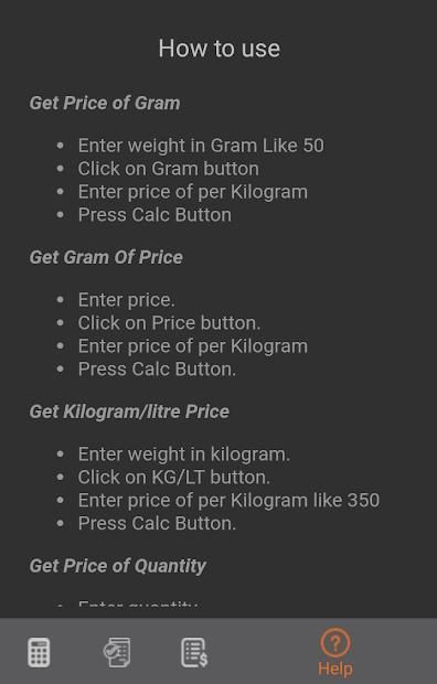 Kalkulator Harga Berat adalah jenis Kalkulator khusus. Menghitung Gram Harga. Harga Gram. Harga Kilogram, Harga kuantitas yang diberikan dan menghitung penambahan sederhana.