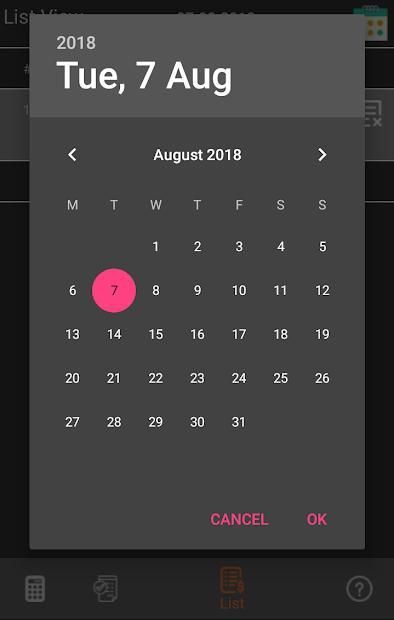 Setiap perhitungan disimpan dalam faktur dengan tanggal tertentu. multiple invoice dapat dibuat untuk set perhitungan yang berbeda. Faktur lama dapat difilter dengan memilih tanggal dari Kalender.
