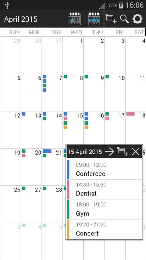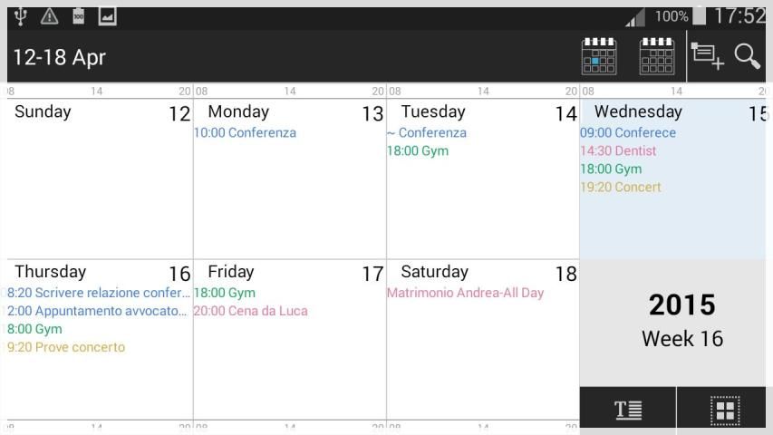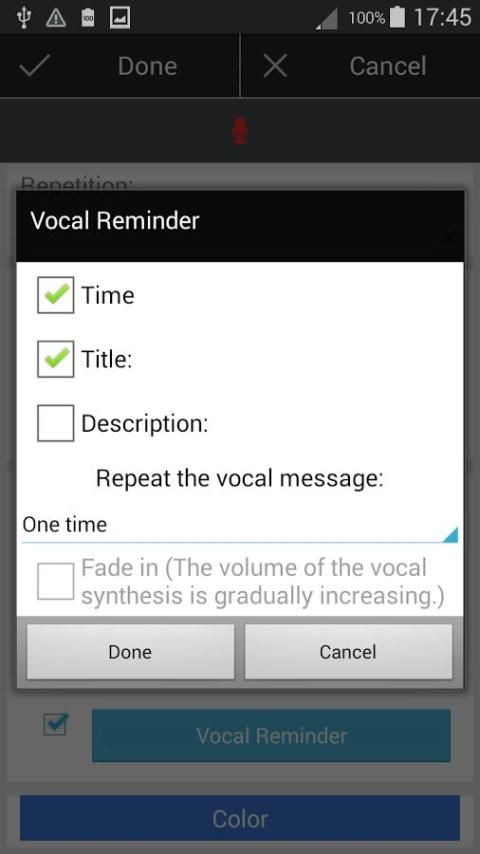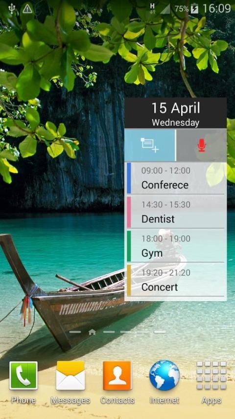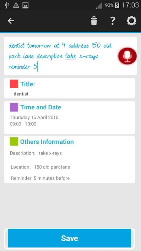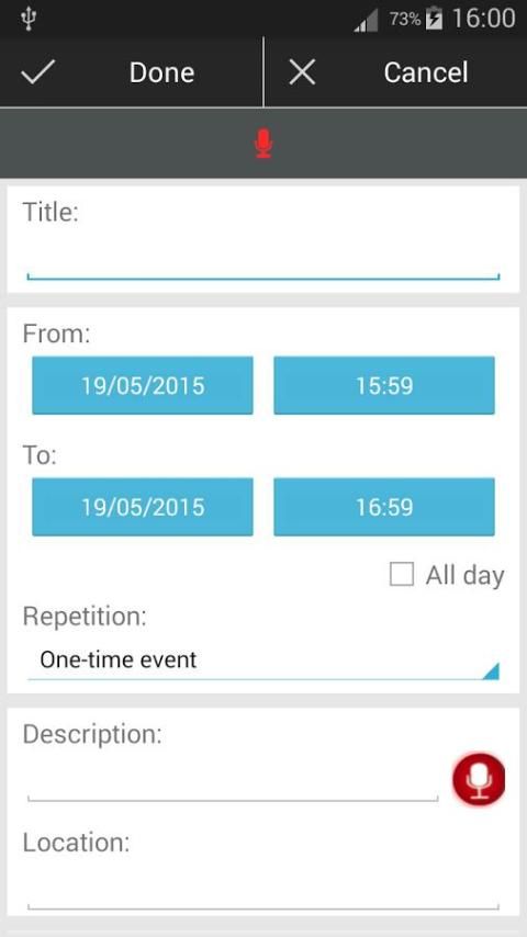 Dengan TalkingCal Anda dapat memasukkan peristiwa menggunakan suara: "gym setiap hari Senin dan Jumat di 19", "dokter gigi besok di 9 alamat 150 Old Park Lane", ... Ini hanya beberapa contoh yang mungkin kalimat. Masukkan peristiwa itu cepat dan sederhana dengan TalkingCal. Jika mau, Anda juga dapat mendengar pesan vokal sebagai pengingat untuk acara: judul, deskripsi, waktu; Pilih apa yang ingin Anda dengar.