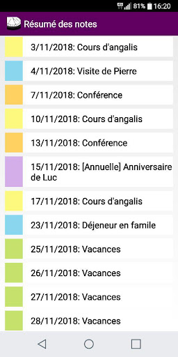 - Catatan Tahunan: Anototasi ulang tahun di kalender, dengan opsi ini untuk mendapatkan pengulangan tahunan. Anda juga dapat mengidentifikasi catatan tahunan dengan warna latar belakang. Dimungkinkan untuk memodifikasi, menghapus atau mengubah catatan dalam catatan harian.