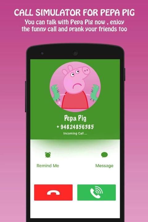 Jika Anda adalah nyata Babi kekasih maka saatnya untuk menikmati panggilan palsu dari babi maya memanggil simulator! Dengan babi ini palsu simulator panggilan Anda dapat mengatur panggilan palsu dari pepa babi dan dapat membuat percakapan ke peppa babi berbicara melalui telepon. Dengan simulator panggilan ini, Anda dapat mengejutkan teman-teman Anda dengan personalisasi setiap panggilan palsu dari pepa babi dan mendapatkan panggilan dari babi virtual dan Anda bisa berpura-pura berbicara di telepon untuk peppa babi. Sekarang Anda dapat bermain dengan teman-teman Anda dan keluarga Anda. Anda hanya perlu men-download dan Anda dapat mulai bermain prank dengan semua teman-teman Anda dan anggota keluarga.