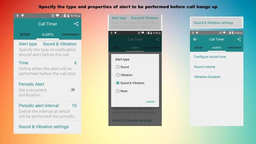 Silakan periksa Aktifkan / Nonaktifkan saklar di SETUP Tab dan bahwa Anda telah memberikan semua yang diperlukan izin (Settings-> Aplikasi -> Panggilan Timer -> Permissions) yang diperlukan untuk bekerja dengan baik dari aplikasi ini.