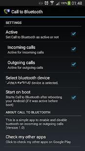 Aplikasi sederhana ini akan memungkinkan bluetooth di ponsel Anda ketika Anda menerima atau membuat panggilan sehingga Anda bisa menjawabnya pada headset bluetooth atau bluetooth perangkat hands-free.