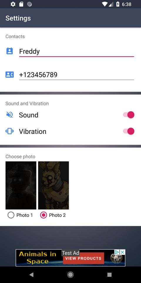 Anda juga dapat mengubah timer, mengubah suara dan memilih mode, mengubah foto panggilan masuk dalam lelucon panggilan palsu freddy. Mengedit nama dan telepon tidak akan menjadi masalah dan ini dapat dilakukan dalam pengaturan.