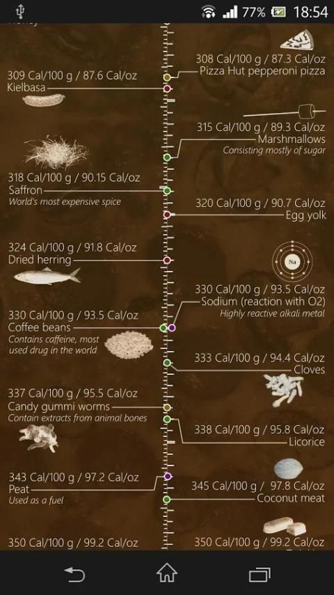 - Mengandung garis grafis komprehensif kepadatan kalori dari berbagai macam buah-buahan yang berbeda, sayuran, sereal, daging, minyak, minuman dan bahan bakar bahkan