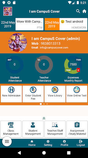 Aplikasi sampul kampus, adalah aplikasi Sistem Manajemen Institut All In One yang menghubungkan institut, guru dan siswa bersama.Aplikasi ini memiliki akun terpisah untuk setiap pengguna.Akun admin memungkinkan administrator untuk mengelola institut, staf dan siswa.Ini mendaftarkan, memonitor, melacak dan menampilkan kehadiran baik guru dan siswa. Aplikasi ini memberikan informasi gaji kepada staf dan informasi ujian kepada siswa.Ini memungkinkan siswa untuk memeriksa status biaya dan materi studi yang diunggah oleh guru mereka.Aplikasi ini dapat digunakan oleh orang tua juga.Itu membuat mereka, guru dan siswa diinformasikan melalui fitur SMS-nya.Siswa yang belum mengisi biaya dikirim pemberitahuan melalui SMS.Aplikasi ini memiliki fitur tambahan yang memungkinkan pengguna untuk mencetak laporan sistem melalui printer nirkabel.