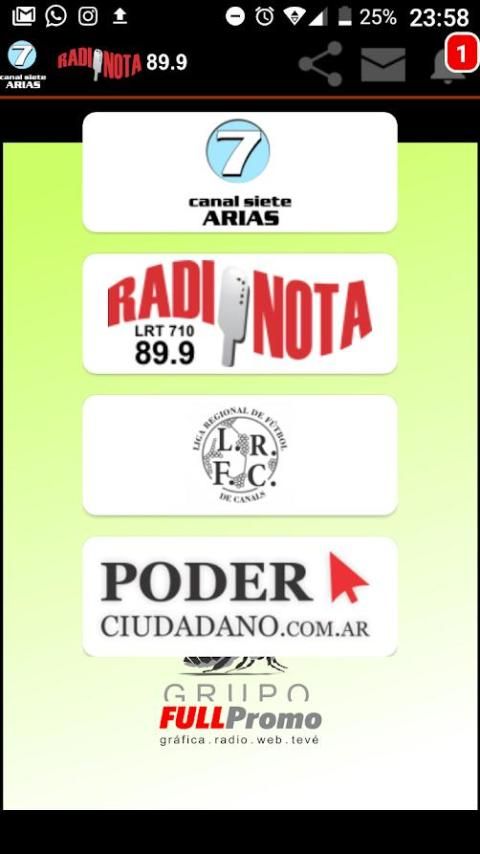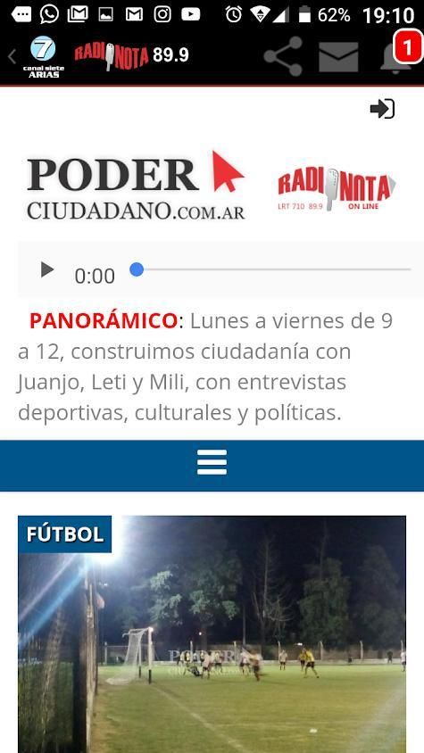 Anda dapat mendownload aplikasi untuk melihat Channel 7 Arias (hidup), mendengarkan Radio Catatan 89,9, membaca portal berita Poder Ciudadano dan menelusuri statistik terbaru dari Daerah Football League Kanal. Namun, di ujung jari Anda, dan gratis!