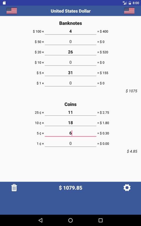 Just count the different denominations and enter the values in the app. The app presents the sub totals and the totals. The values entered are saved until you tab the reset button.
