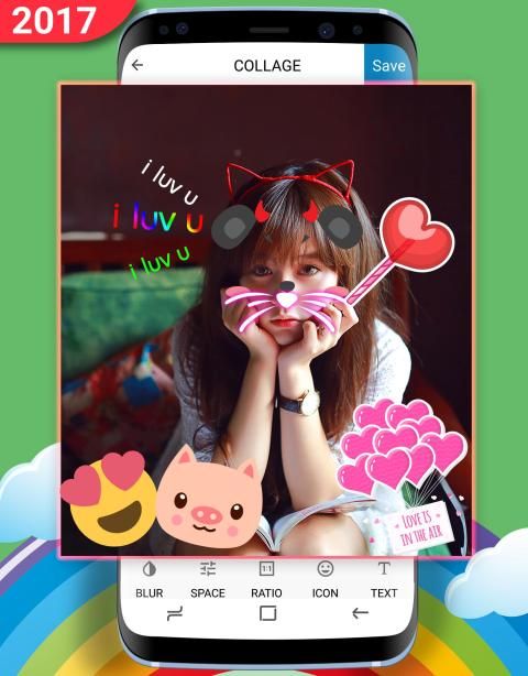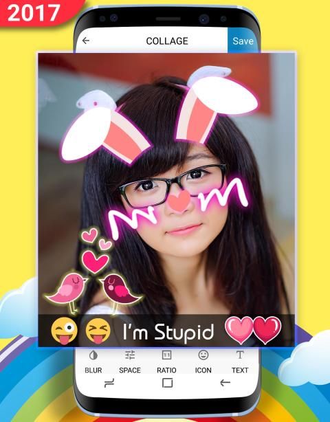 Aplikasi ini menggunakan foto Anda, wajah lucu, stiker lucu, latar belakang, teks dengan font dan bingkai keren.